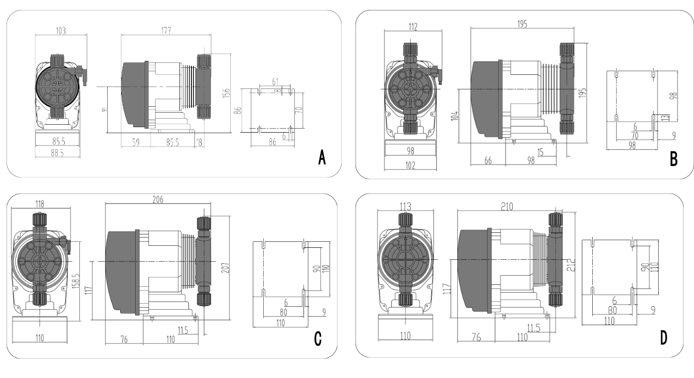 DFD手動系列 | 型號 | 流量 | 壓力 | 沖程頻率 | 功率 | 外形尺寸 |