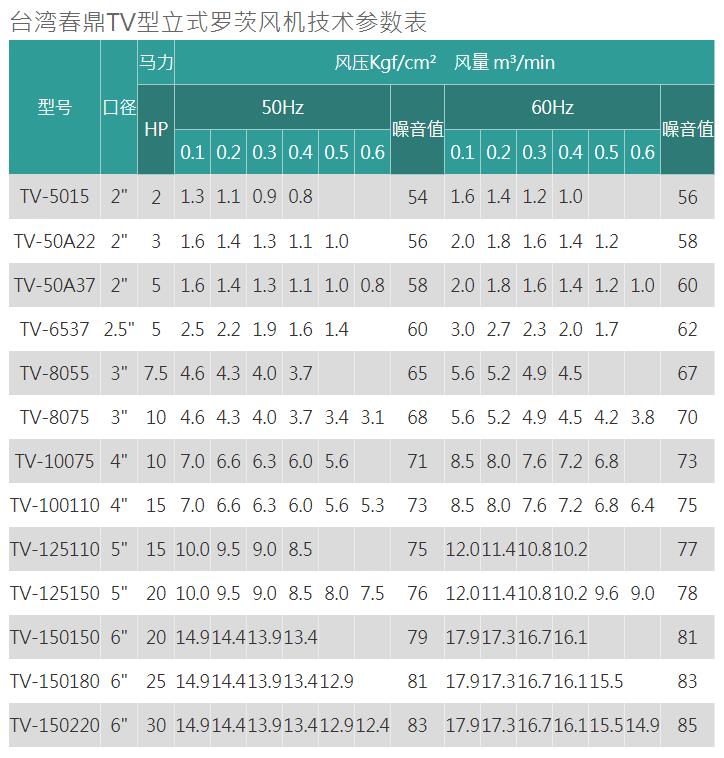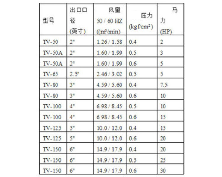 六.春鼎TV型直立式羅茨風(fēng)機(jī)產(chǎn)品規(guī)格: 壓送用途適用壓力∶0 ~ 0.6 kgf/cm2 2 ~ 30HP另外可依特殊材質(zhì)指定設(shè)計(jì)TV型直立式羅茨鼓風(fēng)機(jī)產(chǎn)品特性較低的能源損耗∶春鼎TV型直立式羅茨鼓風(fēng)機(jī)的設(shè)計(jì)能減少逆流對(duì)轉(zhuǎn)子的壓力, 相對(duì)也能減少對(duì)能源的損耗。較低的噪音∶壓力脈沖是主要的噪音源,春鼎直立式羅茨鼓風(fēng)機(jī)相較于皮帶式羅茨鼓風(fēng)機(jī)能有效降低噪音達(dá)五分貝。減免經(jīng)常性之保養(yǎng)困擾∶春鼎直立式羅茨鼓風(fēng)機(jī)采用直結(jié)式傳動(dòng),可減免皮帶之經(jīng)常性損耗保養(yǎng)及機(jī)氣漏油之困擾。機(jī)器體積小,不占空間∶春鼎直立式羅茨鼓風(fēng)機(jī)體積小,不占空間,而出氣口可依現(xiàn)場(chǎng)環(huán)境調(diào)整方向,安裝容易。裝置簡(jiǎn)單∶裝置簡(jiǎn)單、省工時(shí)、不占空間、不需隔音設(shè)備┅┅即達(dá)成低噪音之生活空間